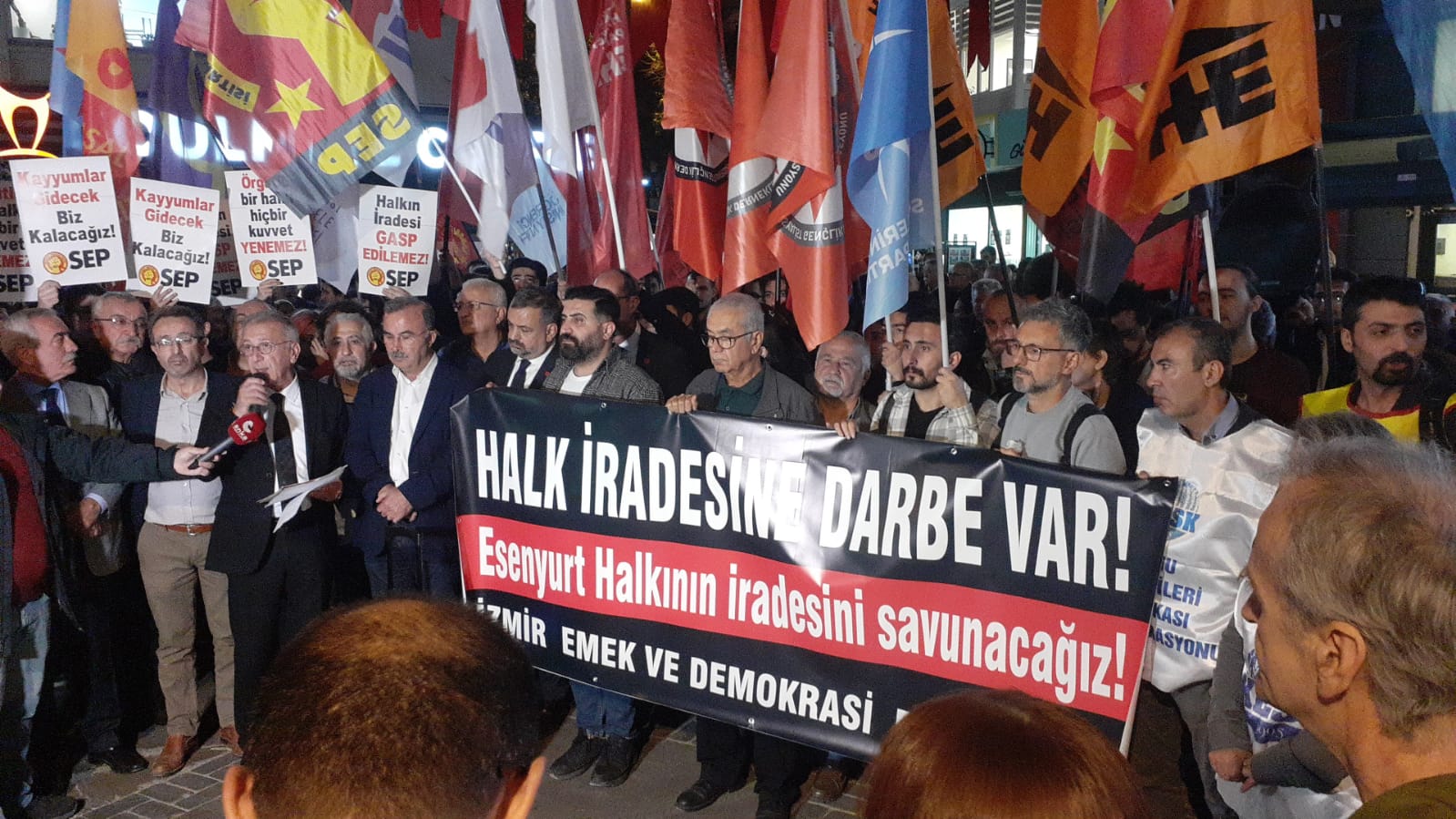 İzmir Emek ve Demokrasi Güçleri, Esenyurt Belediye Başkanı Ahmet Özer’in tutuklanması ve yerine kayyum atanmasını Türkan Saylan Kültür Merkezi önünde protesto etti. “Halkın iradesine darbe var. Halkın iradesini savunacağız” pankartı arasında toplanan katılımcılar “faşizme karşı omuz omuza”, “Kayyumlar gidecek biz kalacağız”, “Kurtuluş yok tek başına ya hep beraber ya hiçbirimiz”, ” Faşizme ölüm halka hürriyet”, “Bu daha başlangıç mücadeleye devam”, “Kahrolsun faşist diktatörlük”, “Gün gelecek devran dönecek AKP halka hesap verecek” sloganları atıldı. Yapılan açıklamada, halkın iradesine saygı gösterilmesi ve kayyum kararlarının derhal geri çekilmesi istendi. Esenyurt Belediye Başkanı Prof. Dr. Ahmet Özer’in hukukla bağdaşmayacak şekilde gözaltına alınması, evinin aranması, tutuklanması ve Esenyurt Belediyesi’ne kayyum atanmasına derhal son verilmesi, Esenyurt Belediye Başkanı Prof. Dr. Ahmet Özer’i derhal serbest bırakılması ve görevine iade edilmesi ve demokrasiyi ayaklar altında çiğnemekten derhal vazgeçilmesi istendi.