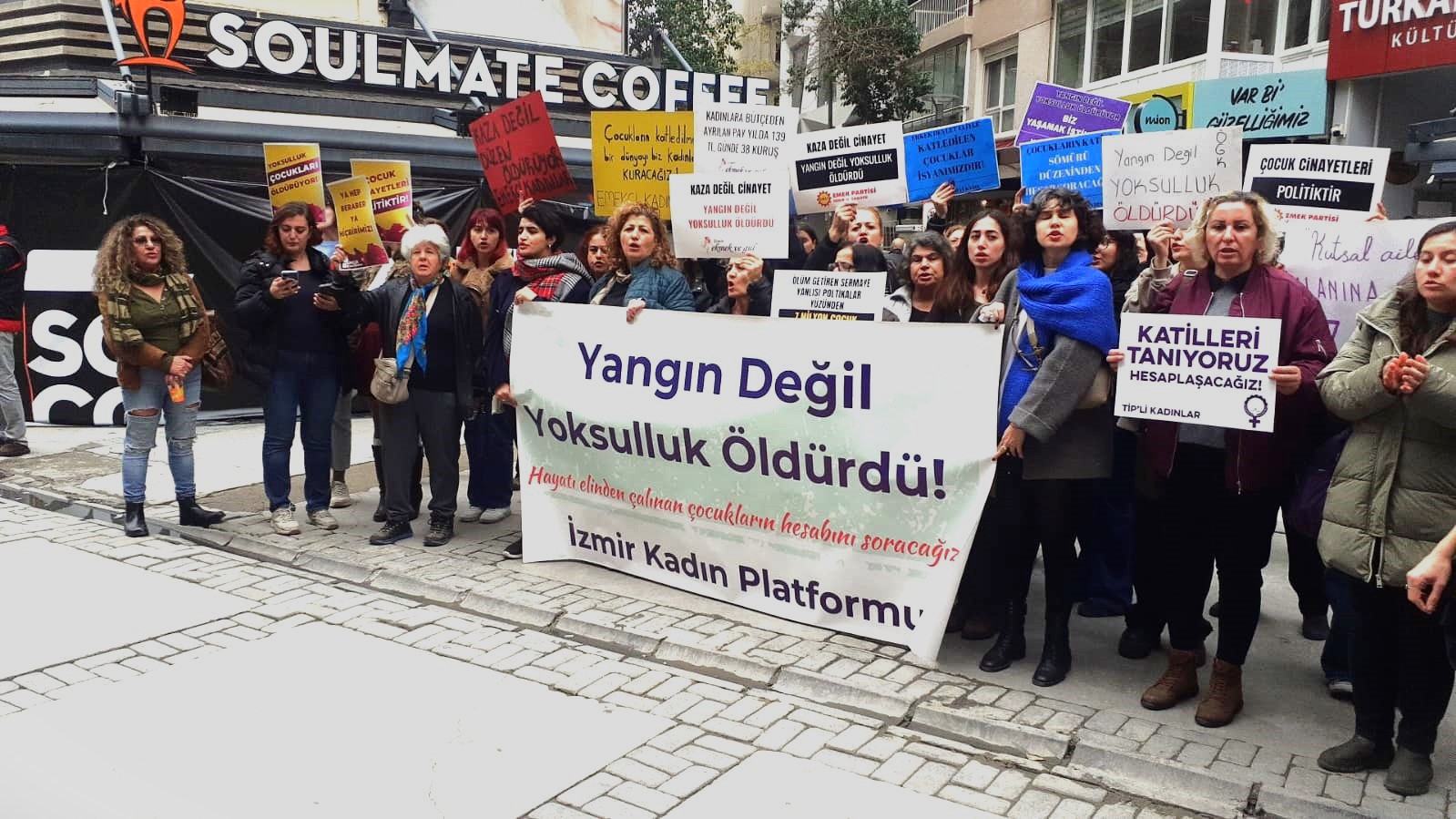 İzmir Kadın Platformu, Türkan Saylan Kültür Merkezi önünde “Yangın değil yoksulluk öldürdü. Hayatı elinden çalınan çocukların hesabını soracağız” pankartı açarak basın açıklaması yaptı. Kadınlar, İzmir’in Selçuk ilçesinde hurdacılık yaparak çocuklarına bakmaya çalışan annenin hurda parasını almak için evden ayrıldığı sırada çıkan yangında yaşamını yitiren beş çocuğu, siyasi iktidarın sermaye yanlısı politikaları ve yoksulluğun öldürdüğünü açıkladı. AKP-MHP siyasi iktidarının kadın cinayetleri ve tacizlerinin suç ortağı olduğunu ve siyasi iktidara karşı kadınları 25 Kasım’da mücadeleye çağırdı. Kadınlar; “AKP elini çocuklardan çek”, “Yangın değil yoksulluk, kaza değil cinayet”, “Sermayeye değil çocuklara bütçe”, “Aileniz batsın çocuklar yaşasın”, “Diyanete değil çocuklara bütçe”, “Kadınlar işe çocuklar kreşe”, “Çocuk cinayetleri politiktir”, “Sermaye elini çocuklardan çek”, “Korkmuyoruz susmuyoruz itaat etmiyoruz”, sloganlarını attı.
