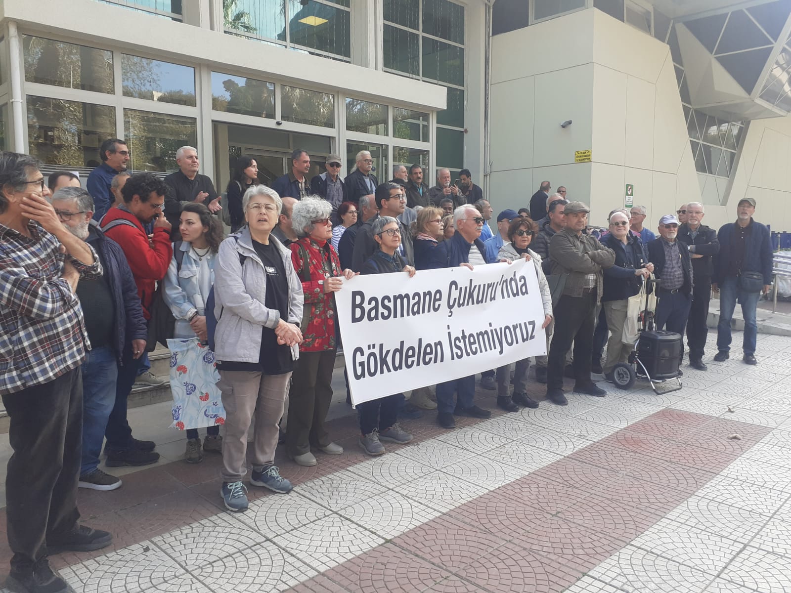 “Basmane Çukuru’nda gökdelen istemiyoruz” pankartının açıldığı açıklama boyunca, sık sık “Söz, yetki, karar İzmir halkının”, “Basmane Çukuru halkındır, halkın kalacak”, “Sermayeye karşı omuz omuza”, “TMSF elini Basmane’den çek” sloganları atıldı. Eyleme çok sayıda siyasi parti, meslek odası, sivil toplum örgütü ve ekoloji örgütü temsilcisi katıldı.