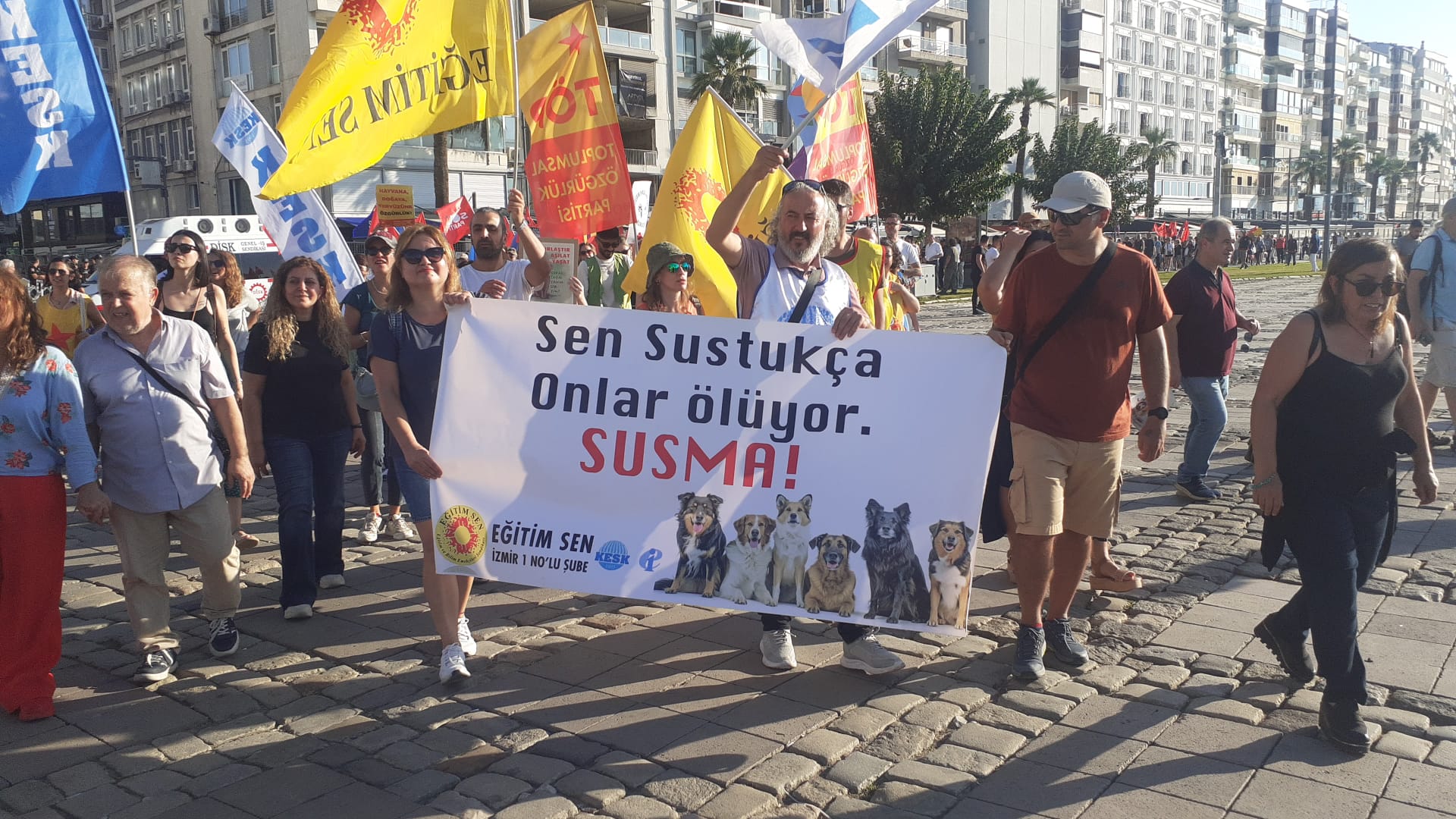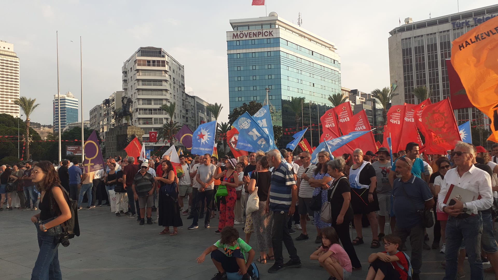 İzmir Emek ve Demokrasi Güçleri, Esenyurt Belediye Başkanı Ahmet Özer’in tutuklanması ve yerine kayyum atanmasını Türkan Saylan Kültür Merkezi önünde protesto etti. “Halkın iradesine darbe var. Halkın iradesini savunacağız” pankartı arasında toplanan katılımcılar “faşizme karşı omuz omuza”, “Kayyumlar gidecek biz kalacağız”, “Kurtuluş yok tek başına ya hep beraber ya hiçbirimiz”, ” Faşizme ölüm halka hürriyet”, “Bu daha başlangıç mücadeleye devam”, “Kahrolsun faşist diktatörlük”, “Gün gelecek devran dönecek AKP halka hesap verecek” sloganları atıldı. Yapılan açıklamada, halkın iradesine saygı gösterilmesi ve kayyum kararlarının derhal geri çekilmesi istendi. Esenyurt Belediye Başkanı Prof. Dr. Ahmet Özer’in hukukla bağdaşmayacak şekilde gözaltına alınması, evinin aranması, tutuklanması ve Esenyurt Belediyesi’ne kayyum atanmasına derhal son verilmesi, Esenyurt Belediye Başkanı Prof. Dr. Ahmet Özer’i derhal serbest bırakılması ve görevine iade edilmesi ve demokrasiyi ayaklar altında çiğnemekten derhal vazgeçilmesi istendi.