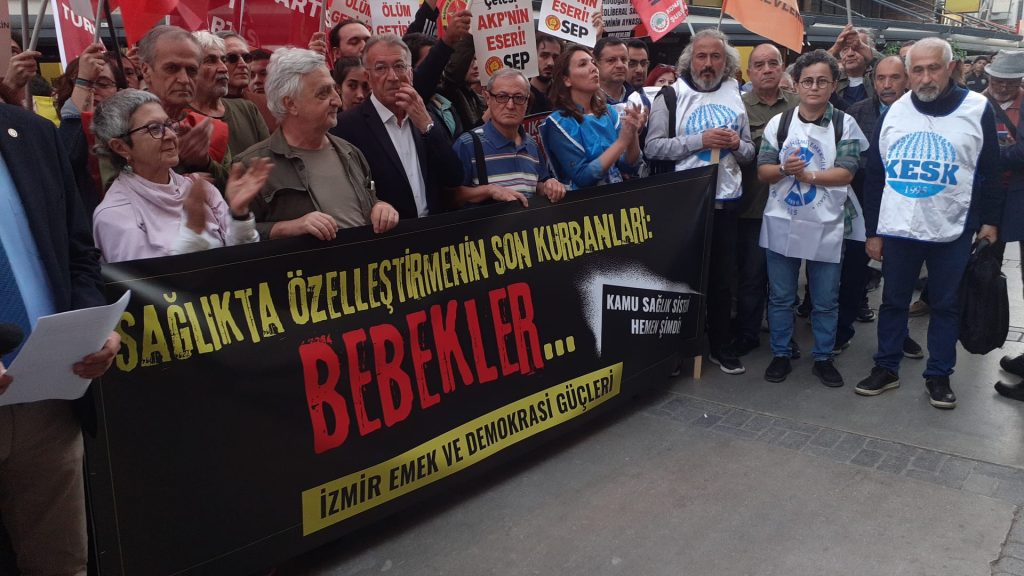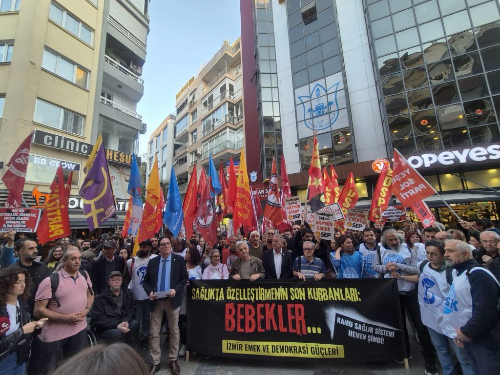 İzmir Emek ve Demokrasi Güçleri, “Sağlıkta özelleştirmenin son kurbanları : Bebekler …Kamu sağlığı hemen şimdi” pankartı açarak, basın açıklaması yaptı. Katılımcılar, “Sağlık hakkı satılamaz”, “Sağlık Bakanı istifa”, “Sağlıkta dönüşüm ölüm demektir.”, “AKP elini bebeklerden çek”, “Bebeklerin katili sermaye devleti”, “Ya kapitalist barbarlık ya sosyalizm”, “Katillerden hesabı halk soracak”, “Sağlıkta ticaret ölüm demektir”, “Yenidoğan çetesi AKP’nin eseri” sloganlarını attı.