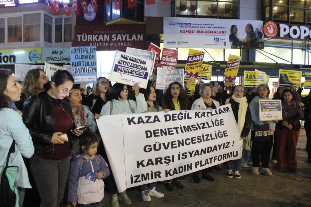 25 Kasım Kadına Yönelik Şiddete Karşı Uluslararası Mücadele Günü dolayısıyla İzmirli kadınlar, Alsancak’ta ÖSYM önünde toplanarak Türkan Saylan Kültür Merkezi’ne yürüdü. Kadınlar “Eşit özgür, güvenceli bir yaşamdan vazgeçmiyoruz” pankartı taşıdı. Yürüyüş boyunca kortejde sık sık “Nehirden denize özgür Filistin”, “Yaşasın kadın dayanışması”, “Katledilen kadınlar isyanımızdır” ve “Görünmeyen emeğin sesini yükselt”, “Susmuyoruz korkmuyoruz itaat etmiyoruz”, “ Nefrete inat yaşasın hayat “, “Kutsal aileniz batsın kadınlar yaşasın”, “Çocuk cinayetleri politiktir”, “Görünmeyen emek sesinin yükselt”, “Kadın yaşam özgürlük”, “Jin jiyan azadi” sloganları atıldı. Yürüyüşün en dikkat çekici görsellerinden biri, ön safta her biri “FREE PALESTINE” harflerini taşıyan kadınların oluşturduğu “Özgür Filistin” yazısı ve metrelerce uzunluktaki Filistin bayrağının kadınlar tarafından taşınmasıydı.