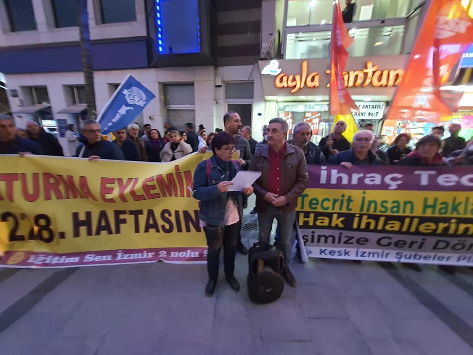 Kanun Hükmümde Kararname’lerle işlerinden ihraç edilen kamu emekçilerinin işlerine iade edilmeleri için mücadele eden Kesk İzmir Şubeler Platformu-Eğitim-Sen 2 Nolu Şube 228.hafta da sokağa çıktı. İktidarın korkutma, sindirme yıldırma, ezme, “ağaç kökü yesinler” politikalarına karşı, haklarından vazgeçmeyen kamu emekçileri, Karşıyaka Çarşısı girişinde taleplerini ifade eden ve tüm emek demokrasi güçlerini de talepleri için mücadeleye çağıran bir basın açıklaması yaptı.