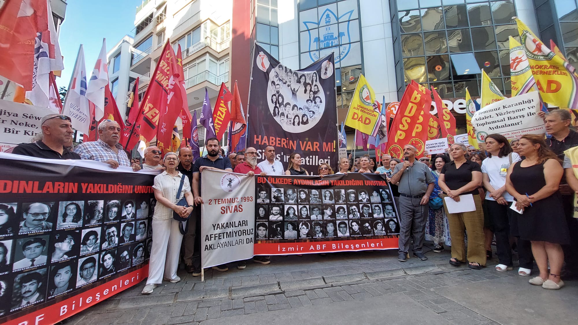 Sivas Madımak Katliamı’nın 32. yıldönümünde, Alevi Bektaşi Federasyonu (ABF) İzmir Bileşenleri tarafından bir basın açıklaması düzenlendi. Alsancak Türkan Saylan Kültür Merkezi önünde yapılan açıklamaya İzmir Emek ve Demokrasi Güçleri ve Konak İlçesi Belediye Başkanı Nilüfer Mutlu da destek verdi.